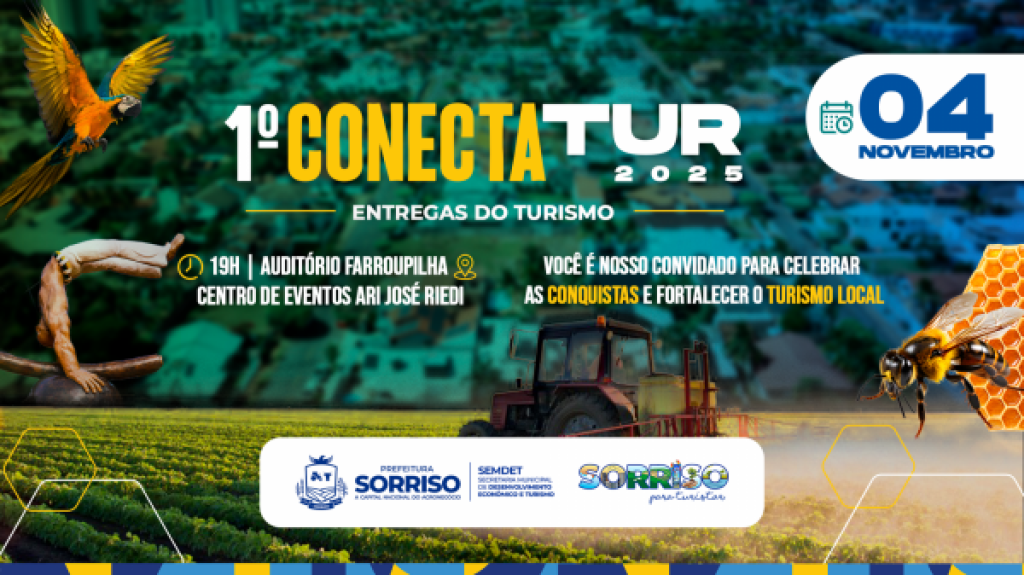 O 1º ConectaTur – Entregas do Turismo acontecerá no próximo dia 4 de novembro, às 19h, no auditório Farroupilha, localizado no Centro de Eventos Ari José Riedi, em Sorriso. A iniciativa é uma promoção da Prefeitura de Sorriso, por meio da Secretaria de Desenvolvimento Econômico e Turismo, com o objetivo de aproximar empresários do trade turístico e a população, promovendo o debate sobre as oportunidades do setor e o futuro do turismo no município.