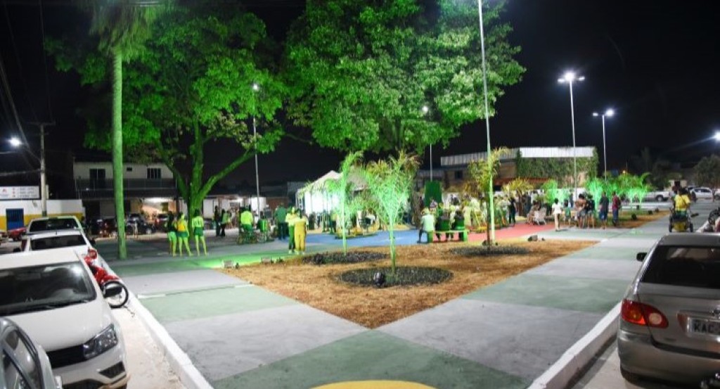 #PraTodosVerem: A imagem mostra a Praça Luzia Valeriano da Silva Dorileo à noite. Há pessoas utilizando o espaço, em pé ou sentadas nos bancos. Ao redor da calçada, é possível ver carros estacionados. No centro, duas grandes árvores são iluminadas por luzes verdes.