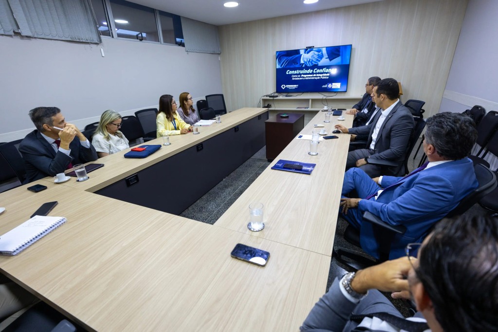 Reunião entre CGE e TJMT em sala com mesa em "U". Sete pessoas assistem a uma apresentação em TV com o título "Construindo Confiança", sobre programas de integridade na administração pública.