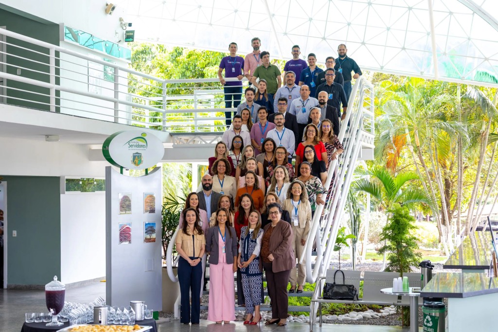 Foto em grupo com dezenas de pessoas posando em uma escadaria metálica branca em ambiente amplo e iluminado.Com o objetivo de conferir maior agilidade às medidas protetivas de urgência para mulheres vítimas de violência, representantes do sistema de justiça e da segurança pública participaram da Oficina de Melhoria de Processo de Trabalho. O evento ocorreu na Escola dos Servidores do Poder Judiciário de Mato Grosso e contou com condução técnica da equipe da Secretaria de Estado de Planejamento e Gestão (Seplag).