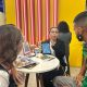 A foto ilustra uma sala com mesas espalhadas no ambiente. Várias pessoas, que são professores, estão sentados em cadeiras, prestando atenção numa palestra.