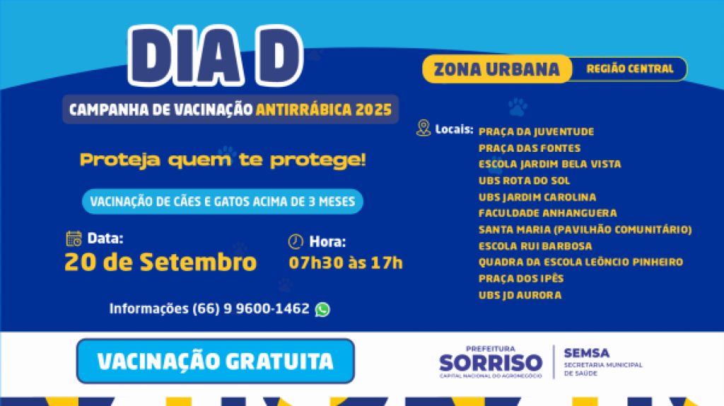 O dia D de vacinação Antirrábica da região Central, acontece neste sábado (20). A ação será realizada das 07h30 às 17h, em 11 pontos estratégicos, garantindo que cães e gatos com mais de três meses recebam a dose anual contra a raiva. A meta é imunizar 18 mil cães e 5 mil gatos.