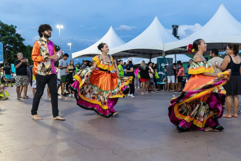 A foto mostra a apresentação do grupo cultural Tibanaré, no encerramento do evento no Parque das Águas.