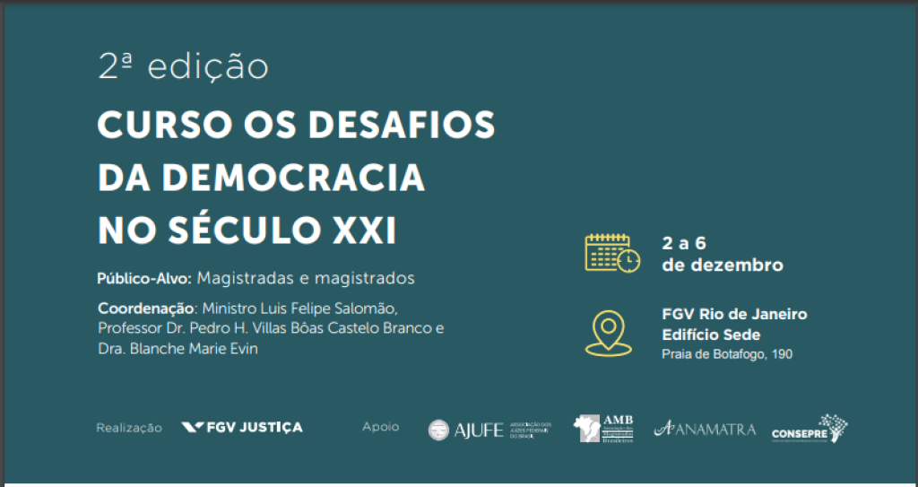 Descrição da imagem: peça publicitária colorida em verde. Texto: Curso os Desafios da Democracia no Século XXI. Público: magistradas e magistrados. Coordenação: ministro Luis Felipe Salomão, professor Dr. Pedro GH Villas Bôas Castelo Branco e dra. Blanche Marie Evin. 2 a 6 de dezembro. FGV Rio de Janeiro, Edifício sede. Praia de Botafogo, 190. Logos: FGV Justiça, Jufe, AMB, Anamatra e Consepre.