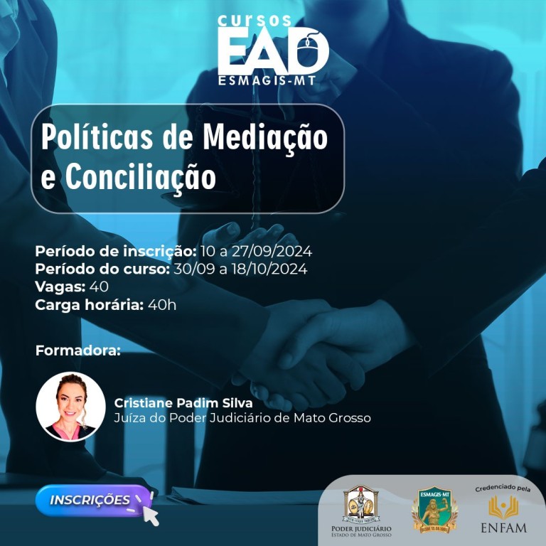 Atenção, magistrados e magistradas! A Escola Superior da Magistratura de Mato Grosso (Esmagis-MT) informa que estão abertas as inscrições do curso “Políticas de Mediação e Conciliação”. Credenciado pela Escola Nacional de Formação e Aperfeiçoamento de Magistrados Ministro Sálvio de Figueiredo Teixeira (Enfam), a capacitação é válida para fins de vitaliciamento e/ou promoção de magistrados(as).