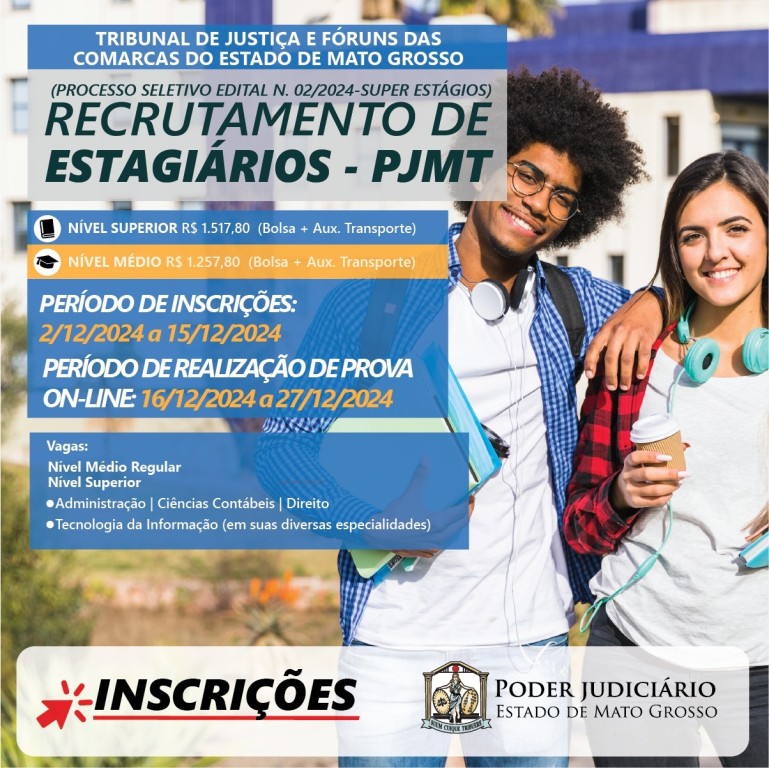 Esta matéria possui recursos de texto alternativo para promover a inclusão das pessoas com deficiência visual. Descrição de imagem: arte gráfica digital colorida. No quadrante esquerdo, há uma imagem vertical de dois jovens, uma moça branca e um rapaz negro. Ele apoia o braço no ombro da moça, que segura um copo descartável. Eles olham para a câmera sorrindo e ambos têm fone de ouvido no pescoço. À esquerda há todo o texto da peça: Tribunal de Justiça e Fóruns das Comarcas do Estado de Mato Grosso. Processo seletivo Edital nº 02/2024 super estágios – recrutamento de estagiários – PJMT. Nível superior R$ 1.517,80 (bolsa + aux. Transporte) nível médio R$ 1.257,80 (bolsa + aux. Transporte). Período de Inscrições: 02 a 15 de dezembro. Período de realização de prova on-line: 16 a 27 de dezembro de 2024. Vagas de nível médio regular e nível superior. Vagas: Administração, Arquitetura e Urbanismo, Ciências Contábeis, Ciências Econômicas, Comunicação Social, Ciências Contábeis, Direito, Tecnologia da Informação (em suas diversas especialidades). No rodapé há um link com a palavra inscrições e uma seta vermelha. Assina a peça o logo do Poder Judiciário do Estado de Mato Grosso.