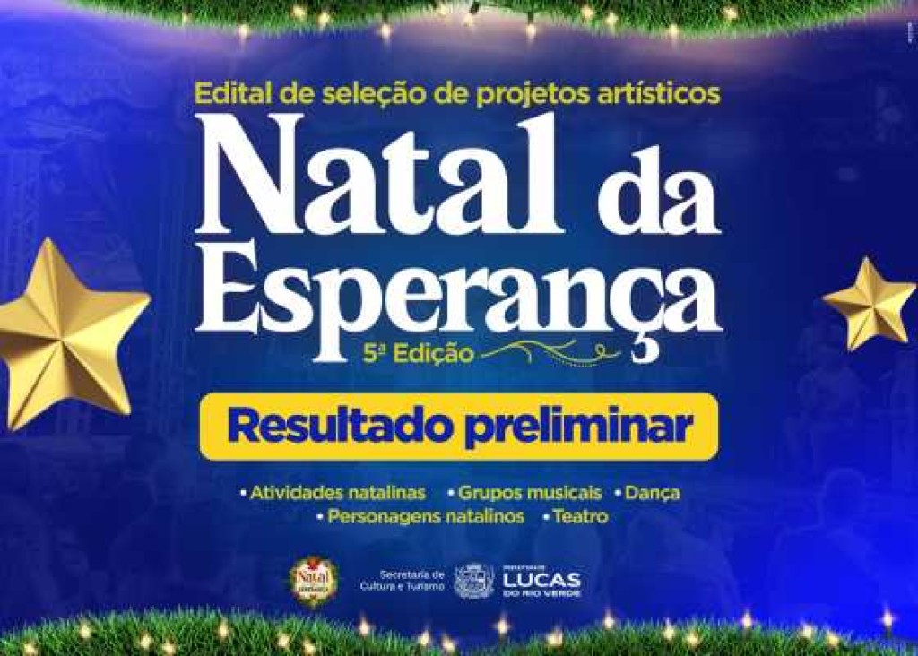 A Prefeitura de Lucas do Rio Verde, por meio da Secretaria de Cultura e Turismo, tornou pública nesta quarta-feira (22), o resultado preliminar dos projetos artísticos inscritos no Edital de Seleção de Projetos Culturais nº 006/2025 – PROMIC “Natal da Esperança”, 5ª Edição. O edital tem como objetivo selecionar produções culturais e artísticas que irão compor a programação do tradicional evento natalino do município.