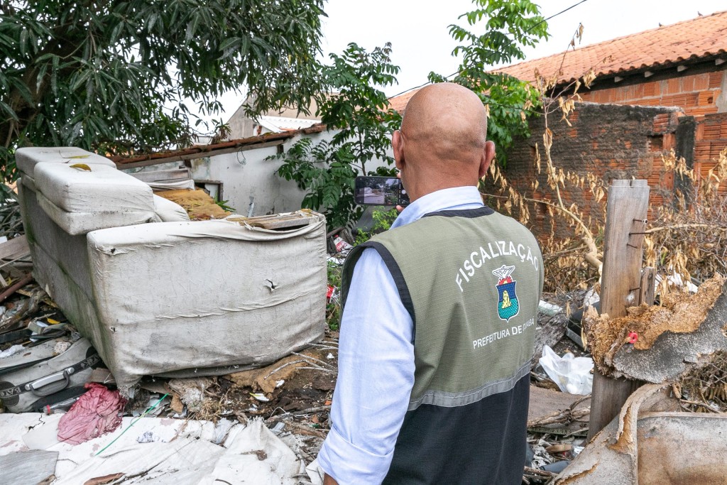 A foto mostra um fiscal da Secretaria Municipal de Ordem Pública durante uma fiscalização em um terreno no bairro Pedra 90.