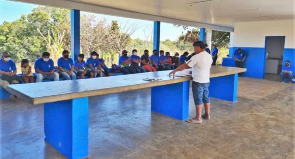 #PraTodosVerem – Na imagem, um grupo de pessoas, muitas vestindo camisetas azuis, está reunido em uma área coberta com colunas azuis e paredes brancas. Elas estão sentadas em bancos ao longo da parede, enquanto um homem em pé, de camiseta branca e bermuda jeans, fala diante de uma mesa retangular de concreto. O ambiente sugere uma reunião comunitária ou escolar em um espaço amplo e arejado.
