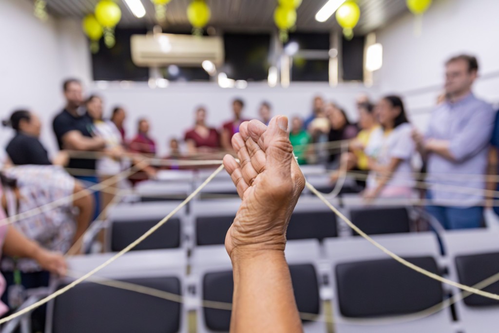 A foto mostra uma mão segurando um fio de barbante, em alusão à “teia da solidariedade”. Ao fundo, é possível ver uma roda de servidores públicos.