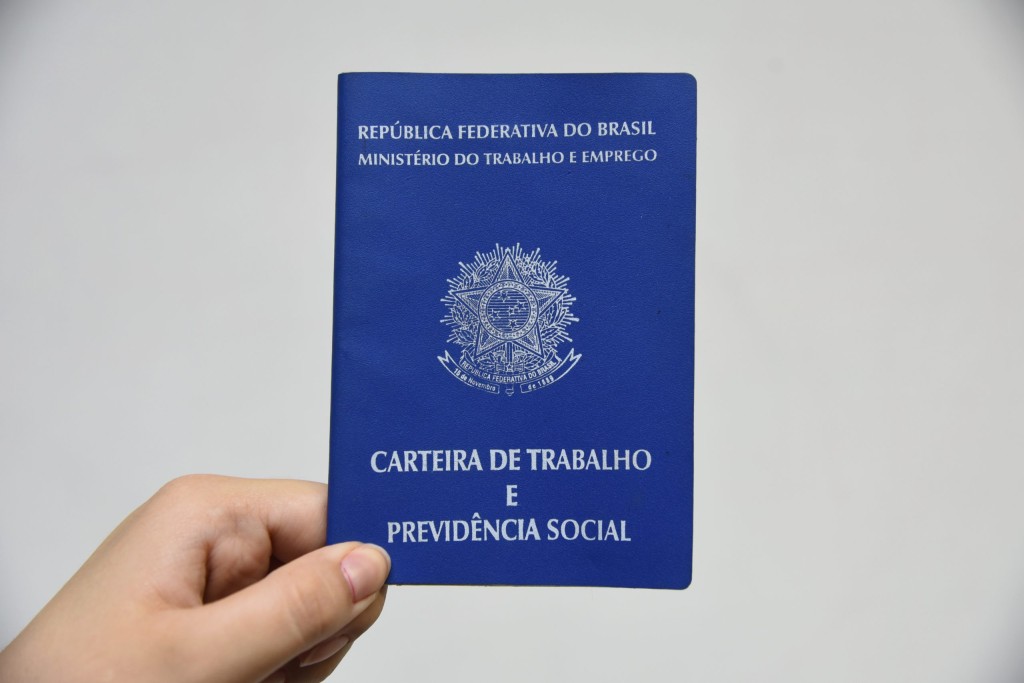 A foto mostra uma carteira de trabalho sendo segurada pela mão de uma pessoa.