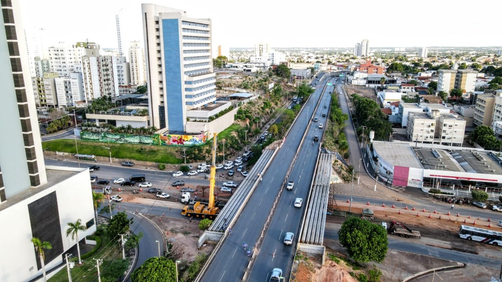 O viaduto da Avenida do CPA está sendo alargado para construção de terceiras pistas nos dois lados, dentro do pacote de obras do Complexo Leblon. As pistas das novas faixas já foram concretadas e estão separadas por cones, para evitar acidentes no local.