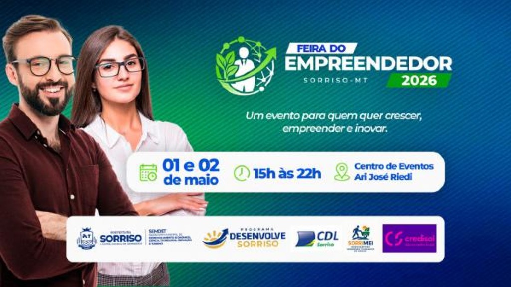 Sorriso se prepara para mais uma iniciativa voltada ao fortalecimento da economia local com a realização da Feira do Empreendedor, que acontece nos dias 1º e 2 de maio de 2026, das 15h às 22h, no Centro de Eventos Ari José Riedi, no bairro Rota do Sol. O evento disponibiliza 64 espaços gratuitos para expositores, reunindo empreendedores de diferentes segmentos.