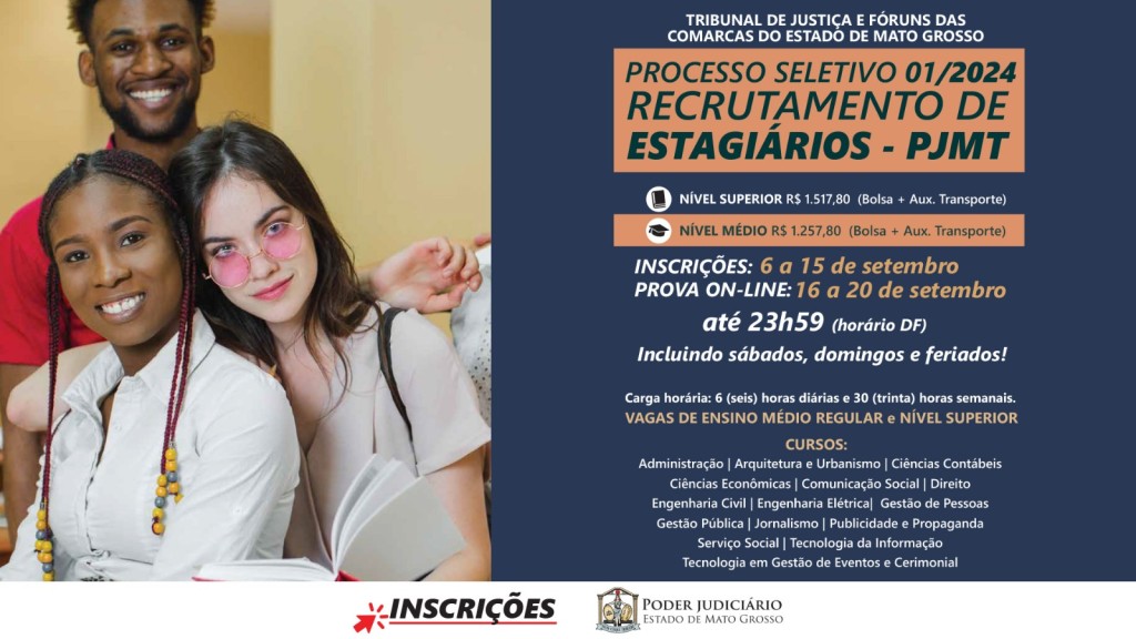 Esta matéria possui recursos de texto alternativo para promover a inclusão das pessoas com deficiência visual. Descrição de imagem: arte gráfica digital colorida. No quadrante esquerdo, há uma imagem vertical de três jovens, duas moças e um rapaz, uma negra e outra branca, abraçadas, e o rapaz negro ao fundo. Uma delas segura um livro, ambas vestem roupas claras. À direita há todo o texto da peça: Tribunal de Justiça e Fóruns das Comarcas do Estado de Mato Grosso. Processo seletivo 01/2024 recrutamento de estagiários – PJMT. Nível superior R$ 1.517,80 (bolsa + aux. Transporte) nível médio R$ 1.257,80 (bolsa + aux. Transporte). Inscrições: 6 a 15 de setembro. Prova on-line: 16 a 20 de setembro até 23h59 (horário DF) incluindo sábados, domingos e feriados! Carga horária: 6 (seis) horas diárias e 30 (trinta) horas semanais. Vagas de ensino médio regular e nível superior. Cursos: Administração, Arquitetura e Urbanismo, Ciências Contábeis, Ciências Econômicas, Comunicação Social, Direito, Engenharia Civil, Engenharia Elétrica, Gestão de Pessoas, Gestão Pública, Jornalismo, Publicidade e Propaganda, Serviço Social, Tecnologia da Informação e Tecnologia em Gestão de Eventos e Cerimonial. No rodapé à esquerda há um link para a palavra inscrições e uma seta vermelha. Assina a peça o logo do Poder Judiciário do Estado de Mato Grosso.